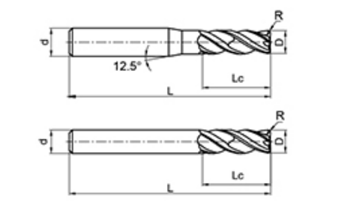 | Nie. | Średnica D | Kąt R R | Długość fletu Lc | Długość całkowita L | Średnica chwytu d | Liczba ostrzy F |
