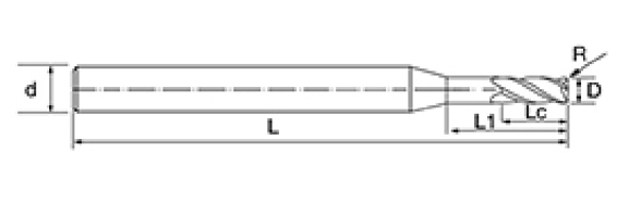 | Nie. | Średnica D | Kąt R R | Długość fletu Lc | Efektywna długość L1 | Długość całkowita L | Średnica chwytu d | Liczba ostrzy F |