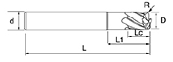 | Nie. | Średnica D | Kąt R R | Długość fletu Lc | Efektywna długość L1 | Długość całkowita L | Średnica chwytu d | Liczba ostrzy F |