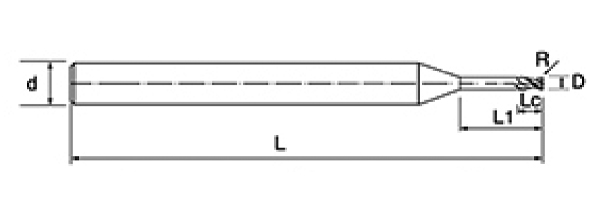 | Nie. | Średnica D | Kąt R R | Długość fletu Lc | Efektywna długość L1 | Długość całkowita L | Średnica chwytu d | Liczba ostrzy F |