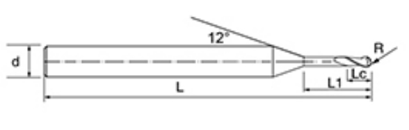 | Nie. | Średnica D | Kąt R R | Długość fletu Lc | Efektywna długość L1 | Długość całkowita L | Średnica chwytu d | Liczba ostrzy F |