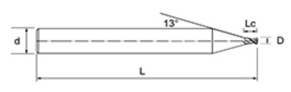 | Nie. | Średnica D | Kąt R R | Długość fletu Lc | Długość całkowita L | Średnica trzpienia d | Liczba ostrzy F |