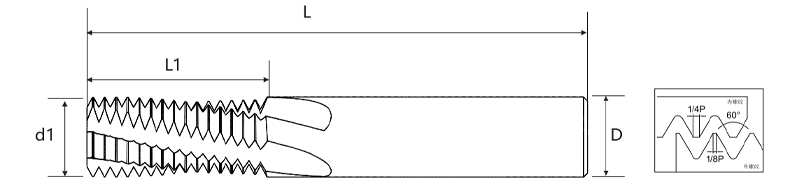 | Skok | Grube zęby UNC | Drobne zęby UNF | Średnica ostrza d1 | Efektywna długość ostrza L1 | Średnica uchwytu D | Długość całkowita L | Liczba ostrzy | Średnica dolnego otworu |