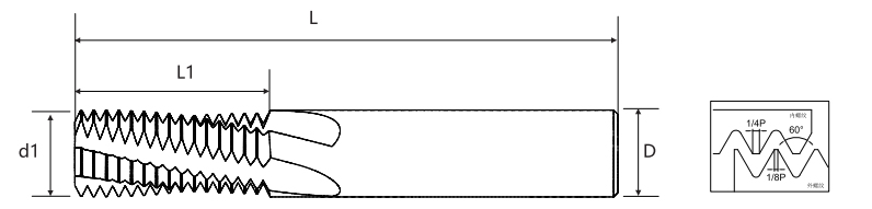 | Skok | Grube zęby UNC | Drobne zęby UNF | Ultra cienkie zęby UNEF | Średnica ostrza d1 | Efektywna długość ostrza L1 | Średnica uchwytu D | Długość całkowita L | Liczba ostrzy | Średnica dolnego otworu |