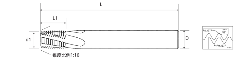 Ten frez nadaje się do różnych materiałów, w tym stali węglowej, stali stopowej, stali nierdzewnej, żeliwa, metali nieżelaznych i tworzyw sztucznych. Dostępne w wielu specyfikacjach, od RC1/16 do 2", zapewnia elastyczność w celu dostosowania do różnorodnych potrzeb zastosowań. Konstrukcja narzędzia umożliwia dostosowywanie konfiguracji parametrów, w tym średnicy skrawania d1, efektywnej długości skrawania L1, średnicy trzpienia D i długości całkowitej L, optymalizując wydajność obróbki i jakość gwintu.